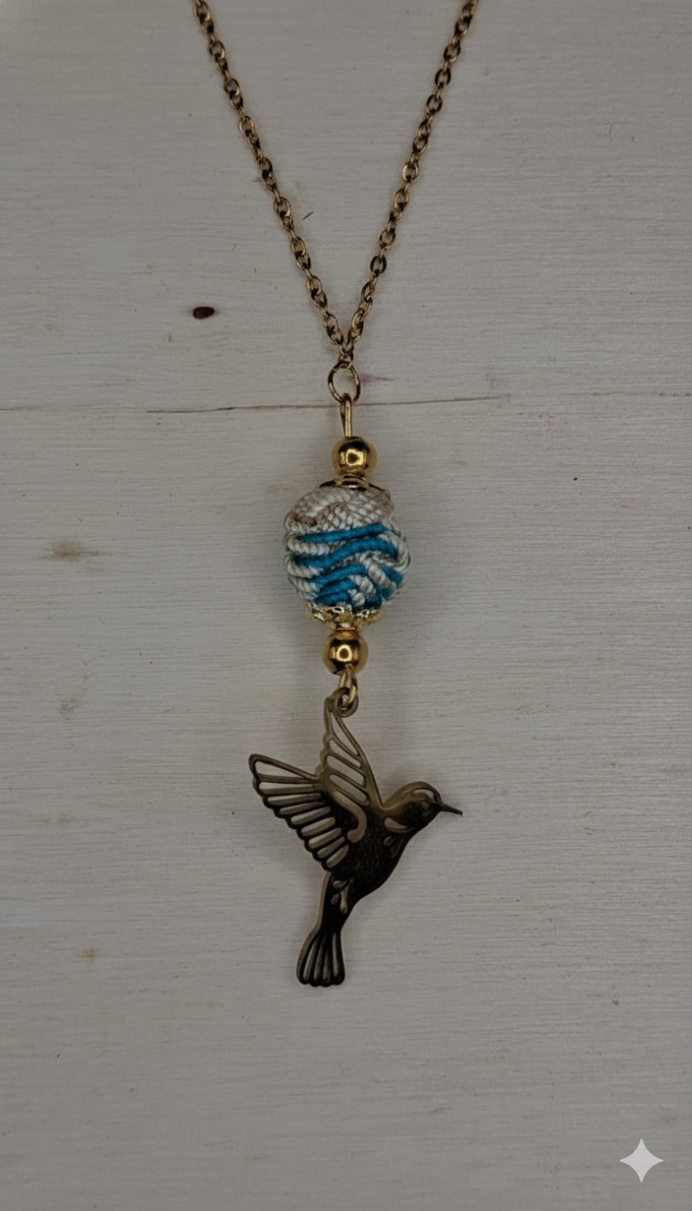 Un colibri d’or prend son essor au bout d’une chaîne éternelle. Il survole une perle de coton, patiement tressée à la main, dont les fils azur capturent l’air du temps. Une alliance délicate entre force brute et grâce artisanale.
