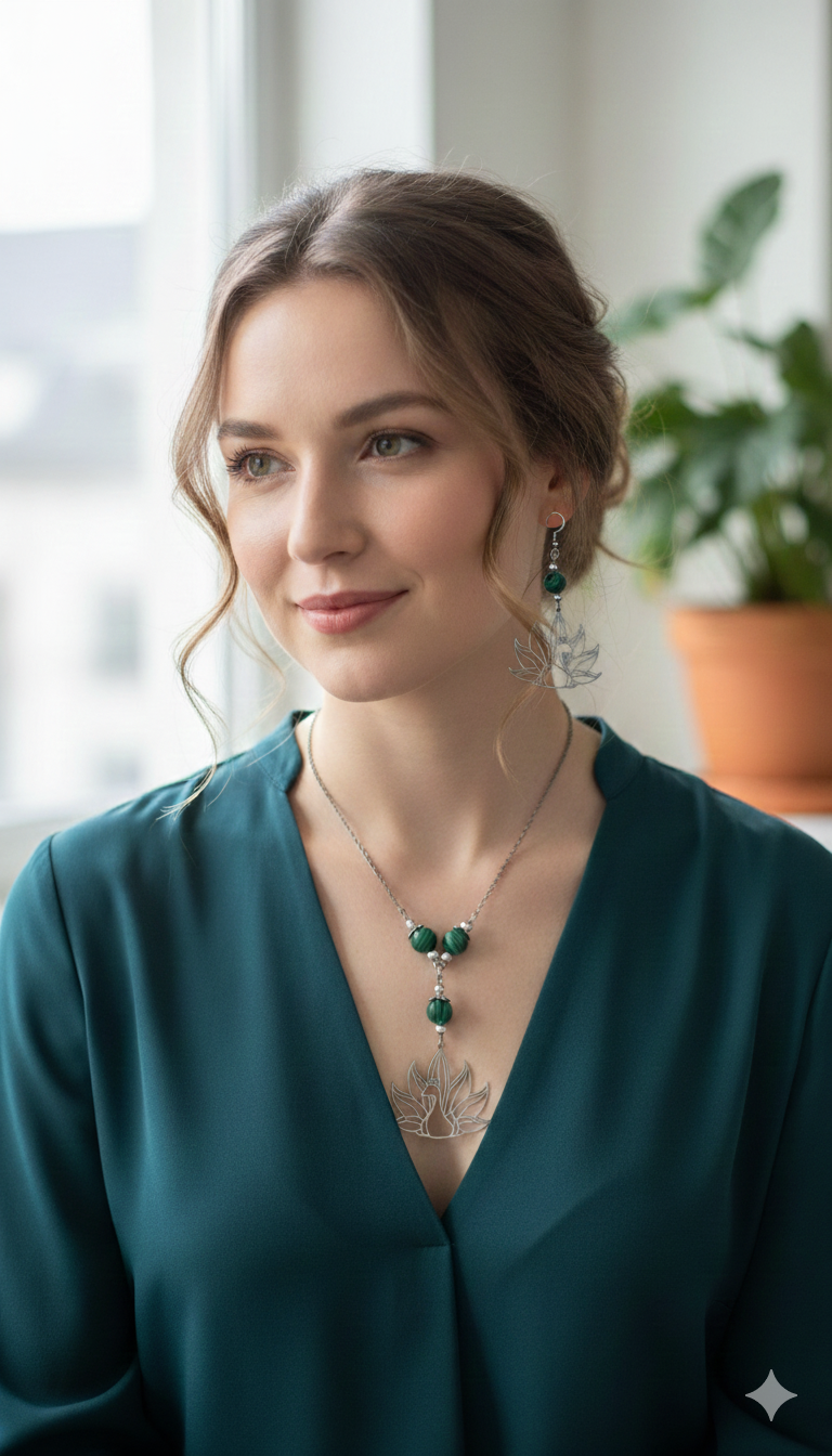 Majestueux tel un paon, ce bijou déploie les nuances sacré de la malachite. Ses perles de laiton, finement nez couronné de chapeaux en métal, célèbrent une nature précieuse. Une création solaire et organique, née pour parer votre cou d’une élégance souveraine.