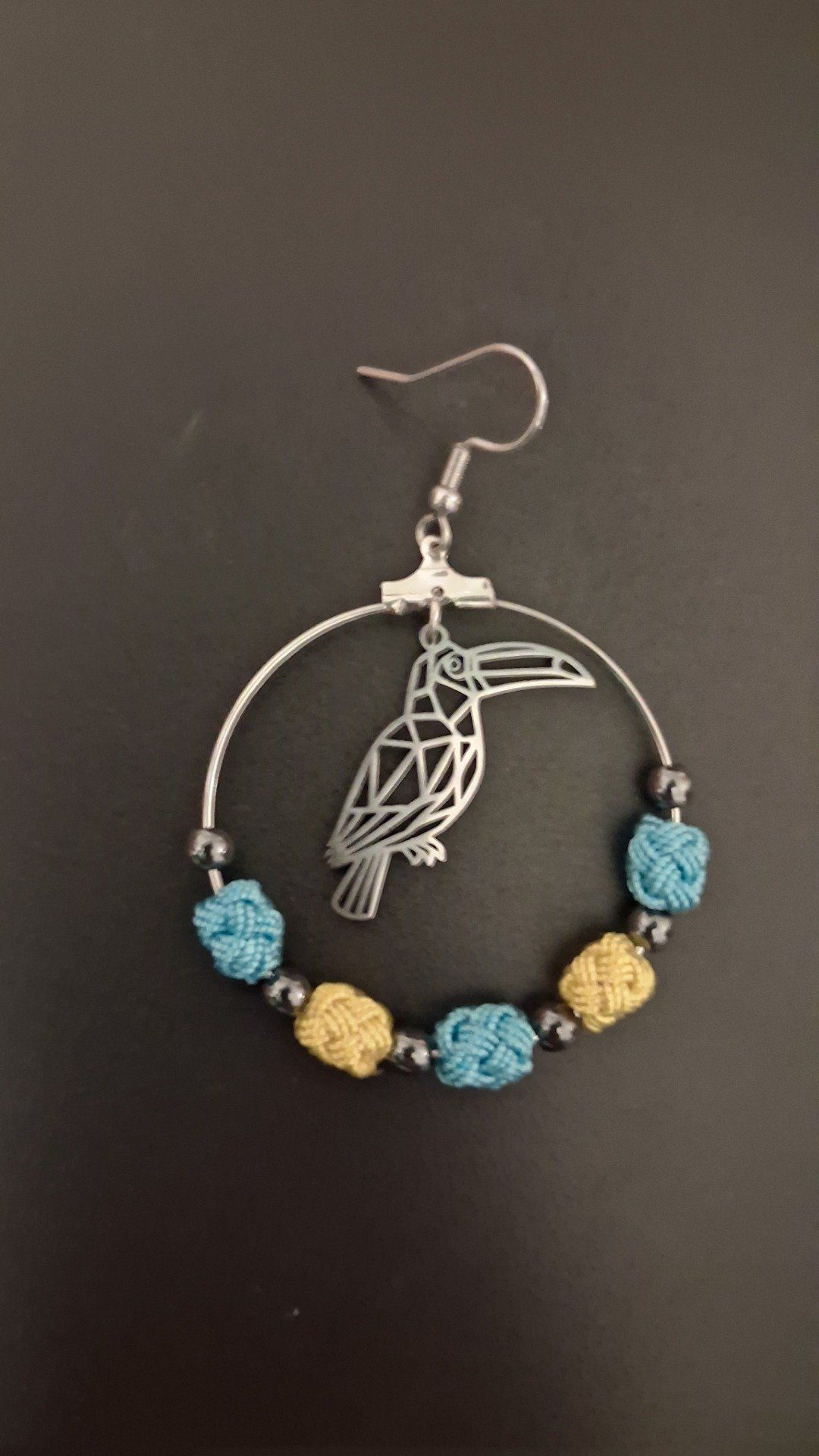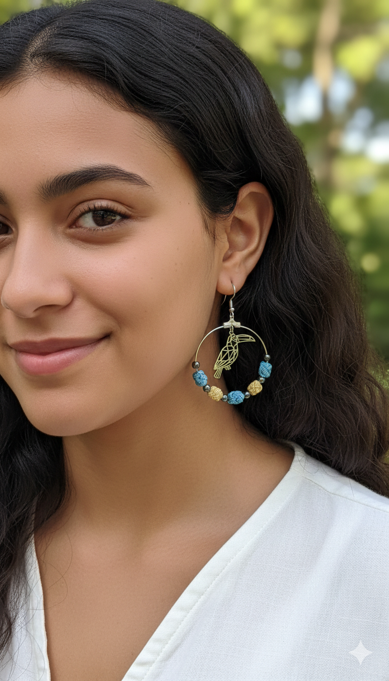 Élegante et solaires ces créoles en acier inoxydable se parent de perles tissées à la main bleu ciel et jaunes d’or. Légéres, elles voltigeront à vos oreilles telles des plumes. Agrémentées d’un pendentif toucan ciselé et de pierres naturelle, ces boucles rafinées allient finesse artisanale et style exotique irrésistible.