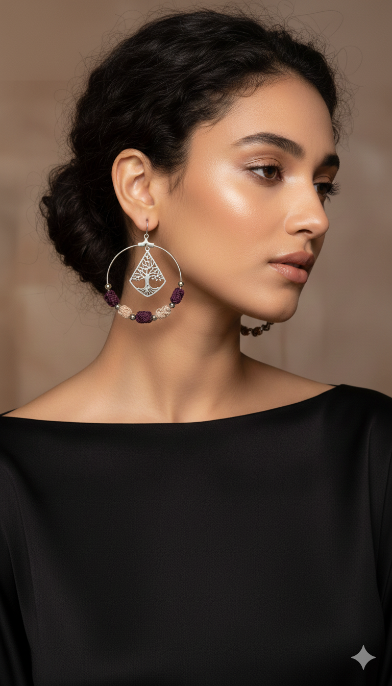 Rayonnez avec cette paire de créoles de 4 cm de diam. argentées orné d'un arbre de vie un tissage artisanal délicat, aux couleurs violet et crème rythmer par de fines perles en laiton. L’alliance parfaite de la douceur et du sens.