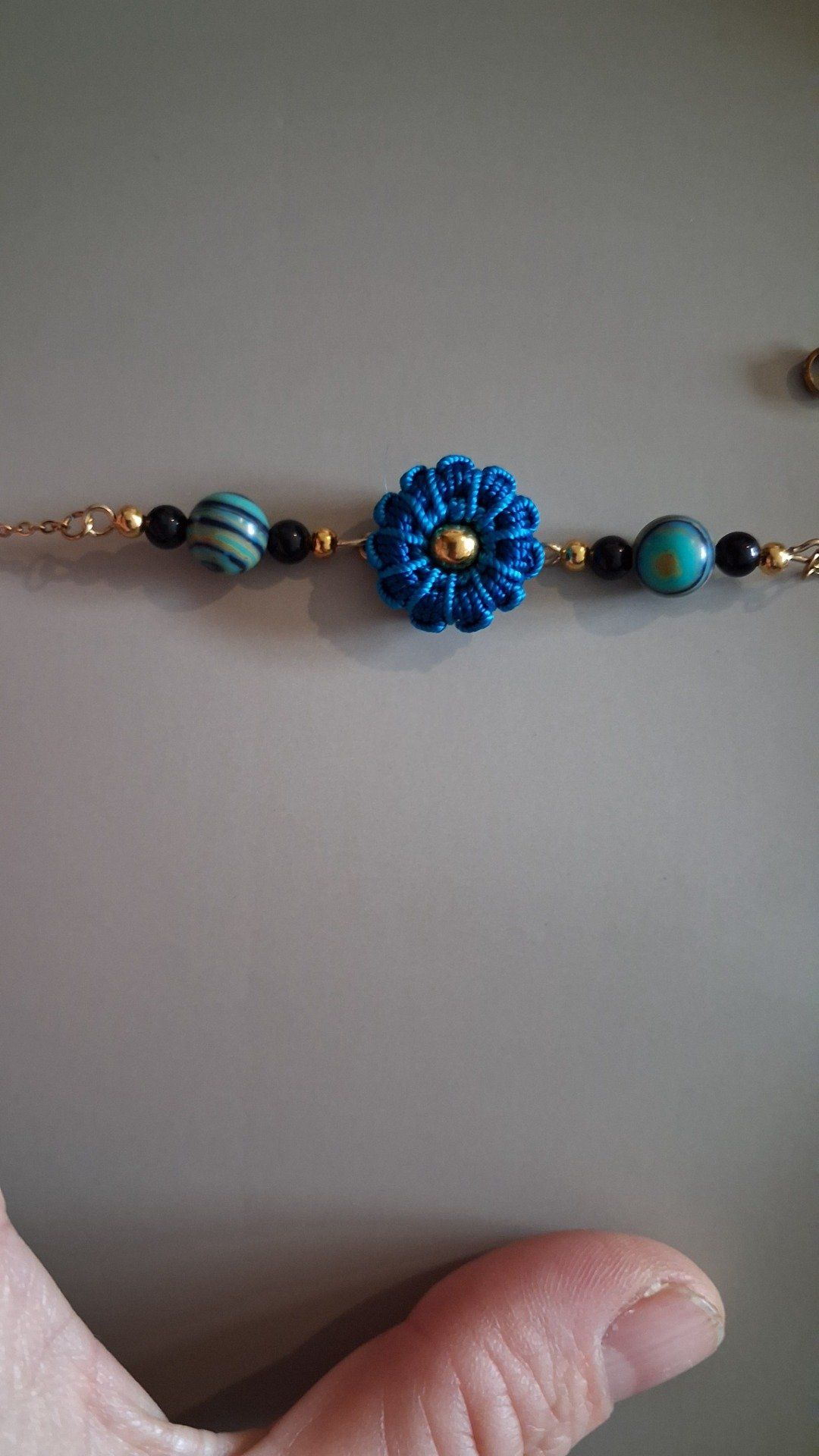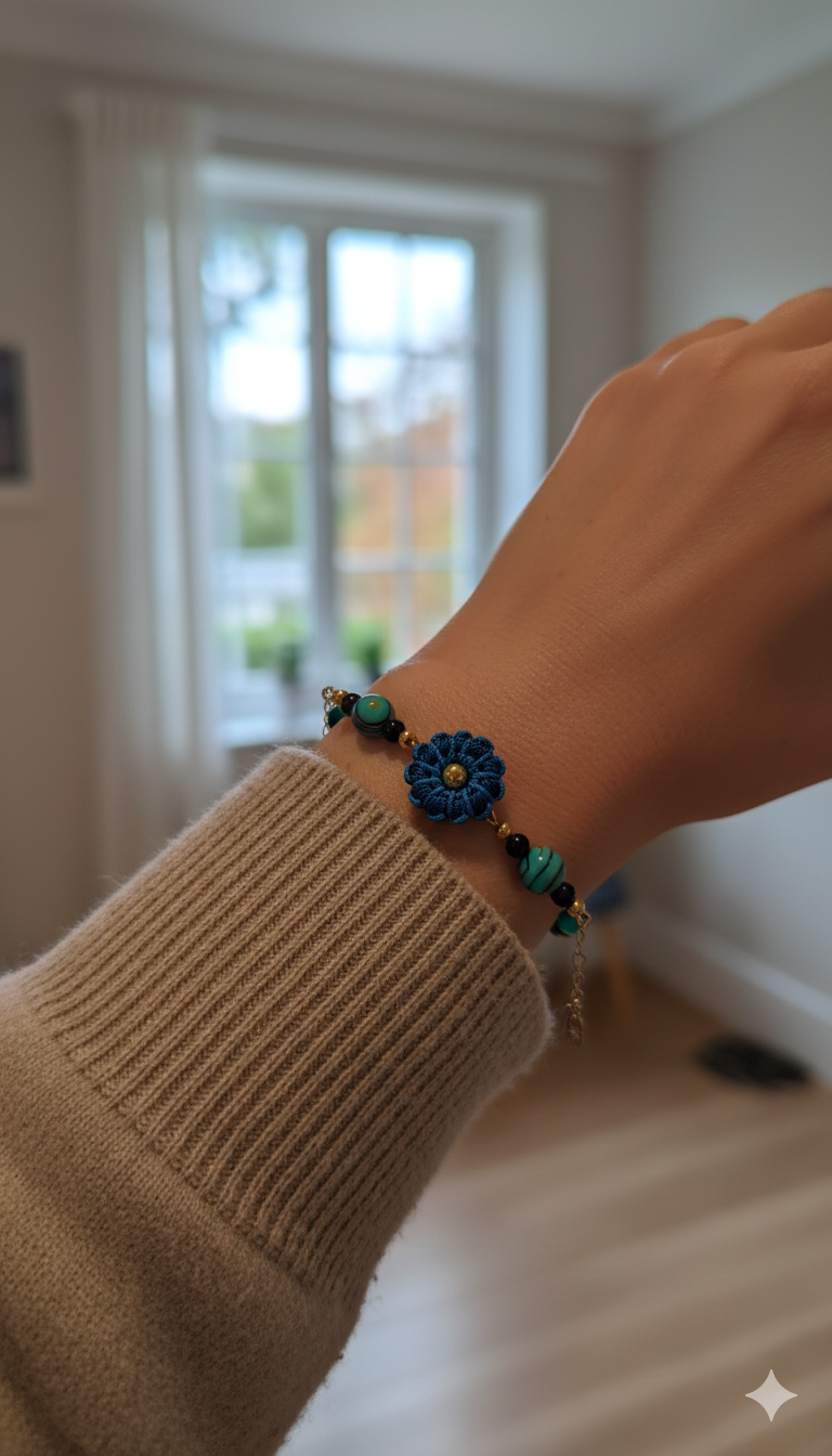 Une jolie fleur de fil d’azur éclot sur la peau, entourée de perles en pierres naturelles aux reflets d’océan et de nuit. Ce jardin miniature tissé à la main avec délicatesse, célébre la rencontre entre l’artisanat et la lumiére. Un soufle de bohéme à votre poignet.