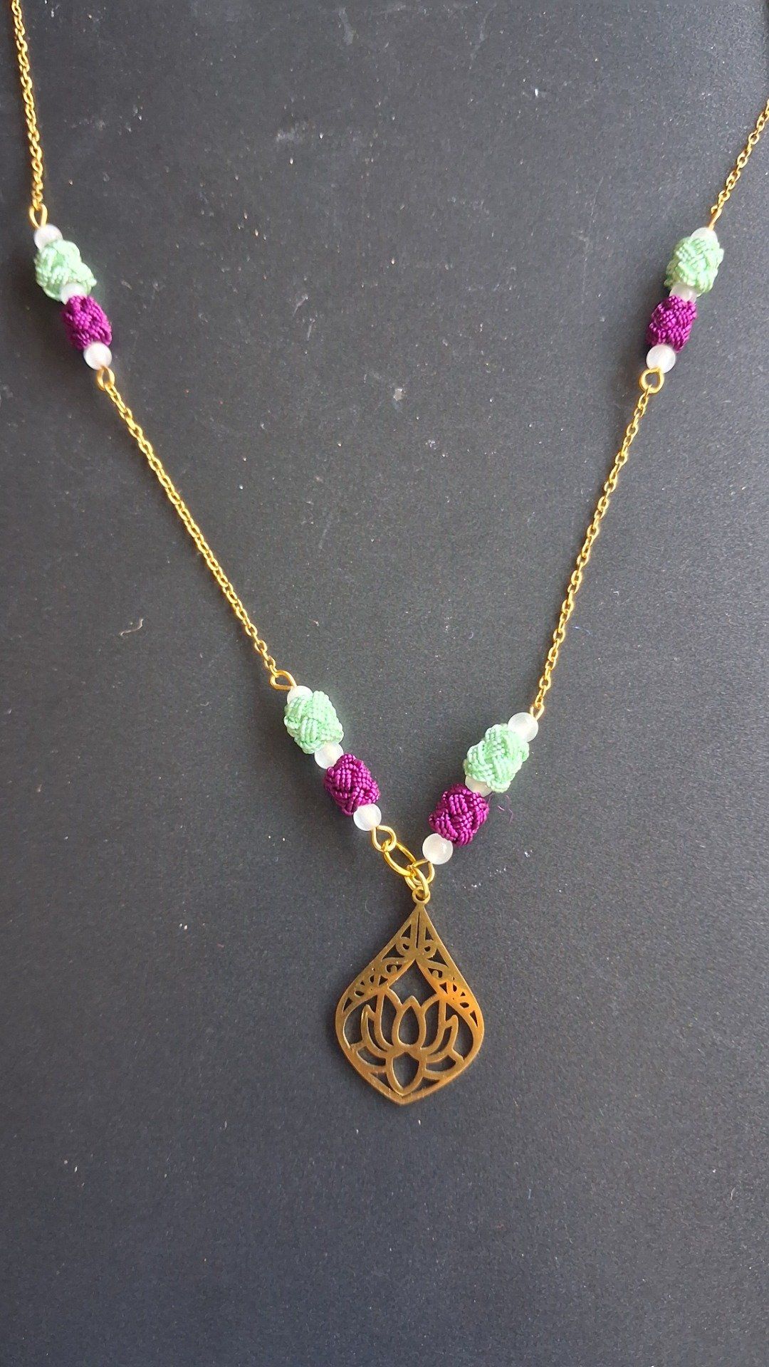 Un bijou engagé en acier inoxydable doré où la pureté des pierres naturelle blanches rencontrent les perles tissées main violet ( couleur de la différence et de l’autisme) et vert menthe. léger, ce collier de 58cm s’achéve sur un lotus.