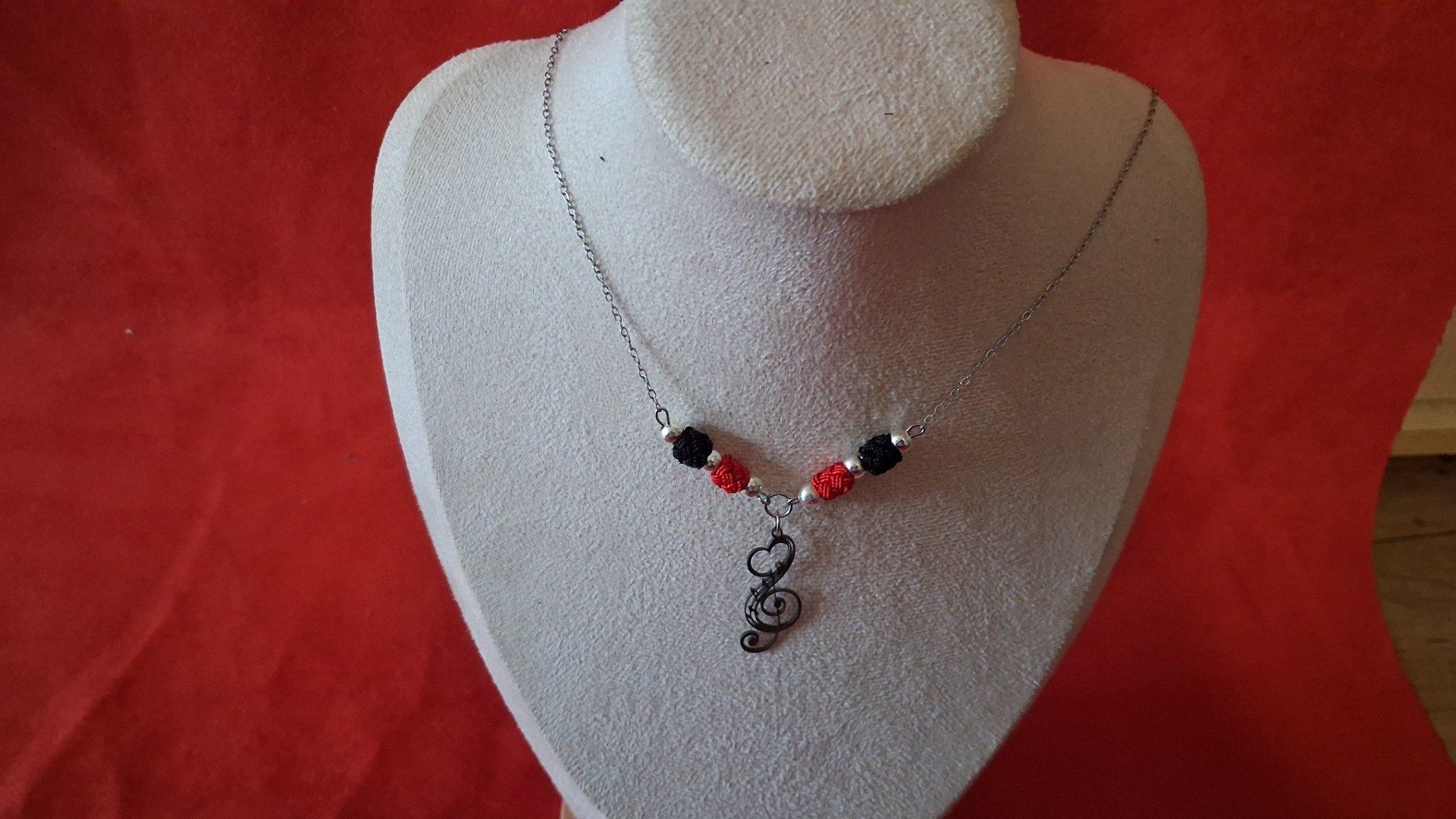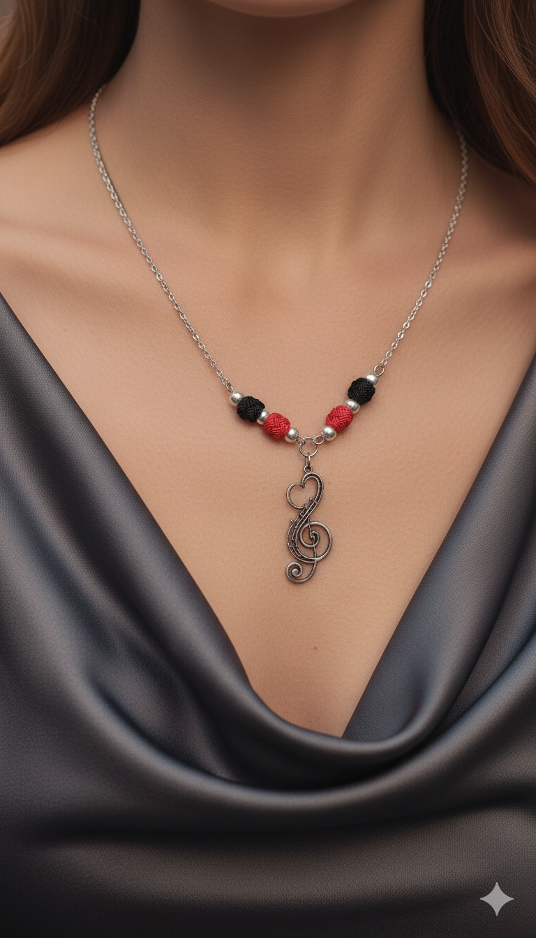 Une symbolique profonde et passionnée, le collier "mélodie du coeur" n’est pas qu’un simple accessoire de mode ; c’est une oeuvre qui raconte une histoire, celle de la passion qui bat la mesure. Le choix du nom et des couleurs fait directement référence à l’âme de la musique: le coeur de la clef de sol. Dans cette création, le rouge et le noir évoquent l’élégance intemporelle des partitions de musique, où l’encre noire dessine les notes avec précision, tandis que le rouge symbolise l’amour, la vie, l’émotion pure.