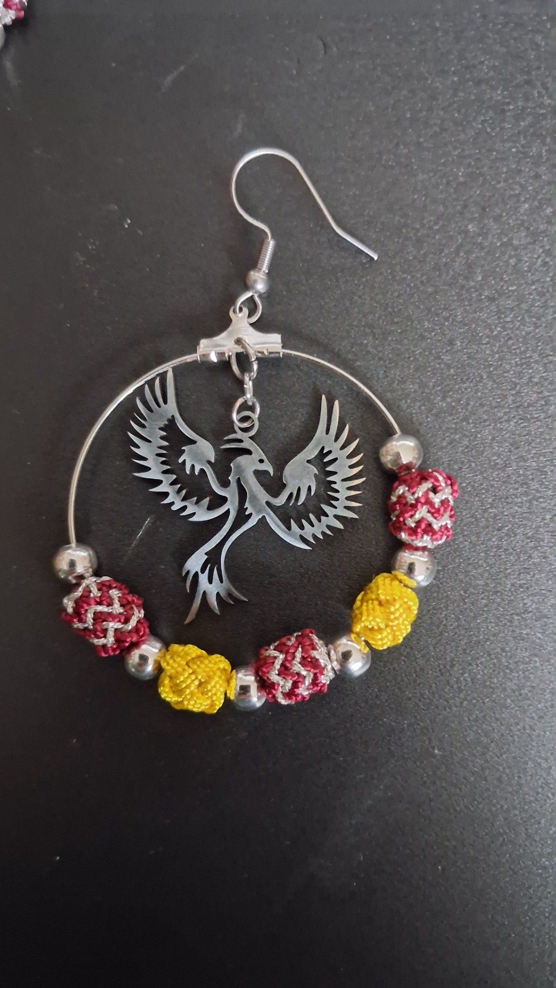 Acier inoxydable argenté, laiton et tissage artisanal bordeaux / argent et jaune d’or. Ces boucles de 4 cm de diamétre incarne la force et la renaissance.