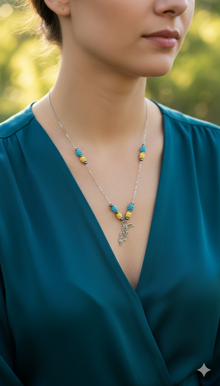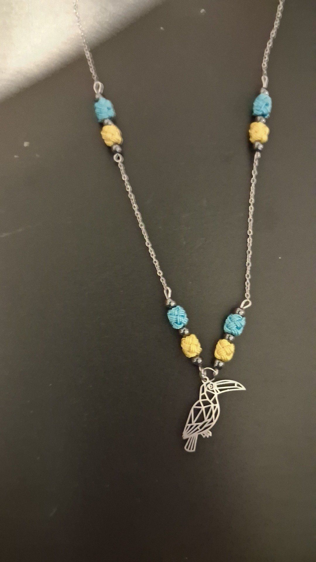 acier inoxydable argenté,pierres noires et perles tissées main bleu et jaune se réunissent pour former ce bijou haut en couleur. Un totem solaire de 56,5cm, symbole d’audace et de liberté.