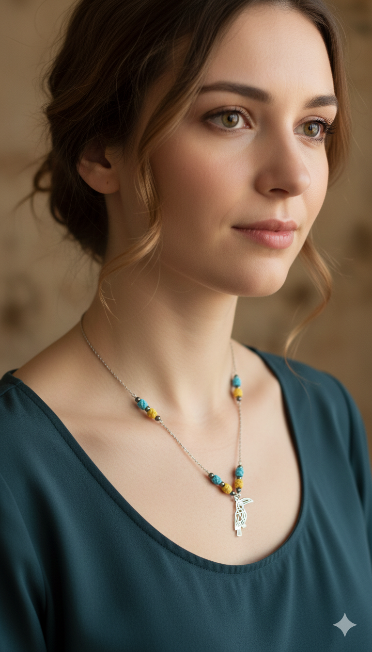 Ce collier unique en acier inoxydable avec ses perles tissées à la main bleu ciel et jaune d’or allient robustesse et éclat durable. Ce collier raffiné original vous mettra élégament en valeur. Orné de pierres naturelles noires, ce bijou artisanal extra léger mettra une touche d’exotisme à votre tenue.